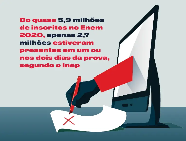 O mais chocante, porém, foi o Exame Nacional do Ensino Médio (Enem) 2020: dos quase 5,9 milhões de inscritos, apenas 2,7 milhões estiveram presentes em um ou nos dois dias da prova, segundo o Instituto Nacional de Estudos e Pesquisas Educacionais Anísio Teixeira (Inep). Em meio à segunda onda da pandemia, o país registrava 26,4 mil casos e 518 mortes pelo novo coronavírus no dia 17 de janeiro, primeiro domingo da avaliação. No fim de semana seguinte, a segunda parte foi realizada enquanto eram diagnosticados 28,4 mil novos casos e 606 óbitos pela Covid-19, de acordo com o consórcio de veículos de imprensa com base em dados das secretarias estaduais de saúde. “Tive muito medo de fazer a prova do Enem este ano. Ficava pensando ‘e se eu pegar Covid no primeiro dia e não conseguir fazer a segunda parte da prova?’’’, conta Márcia Fabrícia. “Acho que só deu tudo certo na minha sala porque cerca de metade dos estudantes faltaram, caso contrário, a minha impressão é de que ela teria ficado um pouco cheia.”